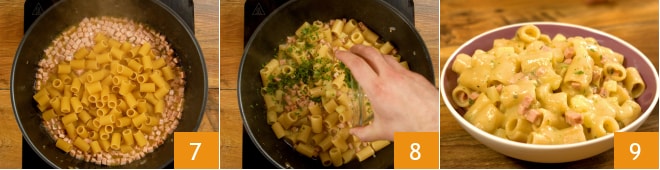 Duften Sie mit gehacktem Salbei ab 7 und geben Sie die Pasta hinein: Kochen Sie sie wie ein Risotto, indem Sie nach und nach heiße Brühe hinzufügen, so dass Sie sie risottieren können 8. Sobald die Pasta mit Kartoffeln und Schinken fertig ist, stellen Sie sicher, dass sie richtig gesalzen ist, und duften Sie sie schließlich mit einem Hauch gehackter Petersilie, bevor Sie servieren 9.