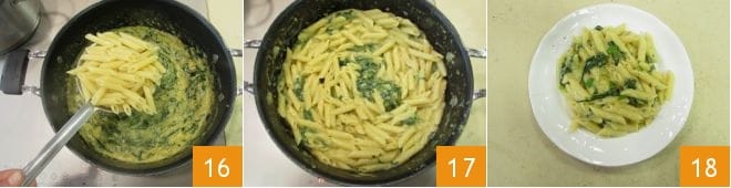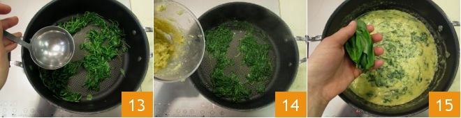 Lassen Sie den Rucola für ein paar Minuten zusammenfallen, indem Sie mit einem Schöpflöffel Nudelwasser helfen 13. Sobald der Rucola zusammengefallen ist, fügen Sie die Kichererbsencreme 14 und weitere Basilikumblätter hinzu 15.