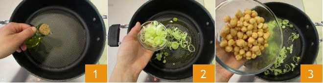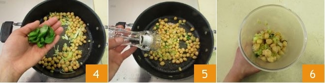 Nachdem der Lauch weich geworden ist, schalten Sie die Hitze aus und fügen die Basilikumblätter hinzu 4, rühren um und pfeffern nach Geschmack 5. Geben Sie die Kichererbsen-Mischung in einen hohen Behälter 6,