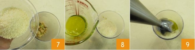 fügen Sie den geriebenen Parmesan 7 zusammen mit dem Öl hinzu 8 und pürieren Sie alles mit einem Stabmixer 9.