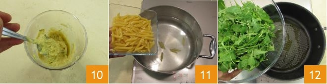 Um eine ausreichend cremige Konsistenz zu erhalten 10, können Sie bei Bedarf ein oder zwei Esslöffel heißes Wasser hinzufügen, um die Creme während der Verarbeitung weiter zu verdünnen. Kochen Sie die Pasta gemäß der auf der Verpackung angegebenen Zeit 11; währenddessen geben Sie in denselben Topf, in dem Sie die Kichererbsen gekocht haben, etwas Olivenöl und fügen den Rucola hinzu 12.