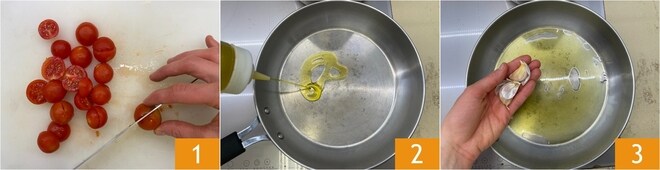 Um die Pasta mit Kirschtomatensoße und Stracciatella zuzubereiten, beginnen Sie damit, die Kirschtomaten zu halbieren 1. In einer großen Pfanne das Öl erhitzen 2 und mit den zerdrückten, ungeschälten Knoblauchzehen aromatisieren 3.
