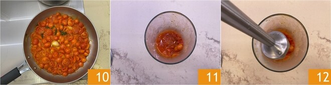 Wenn die Kirschtomaten gekocht und weich sind 10, geben Sie sie in einen Krug 11 und pürieren Sie sie mit einem Stabmixer 12.