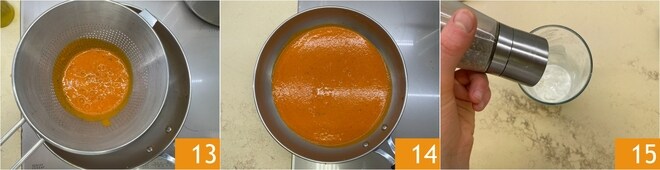 Passieren Sie die entstandene Creme durch ein feines Sieb, um die Schalen und Kerne der Tomaten zu entfernen 13. Behalten Sie die Kirschtomatencreme in der Pfanne 14. In einem weiteren Krug würzen Sie die Hälfte der Stracciatella mit Salz und Pfeffer 15,
