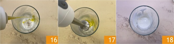 Gießen Sie das Olivenöl hinein 16 und pürieren Sie 17, bis Sie eine glatte und seidige Konsistenz erhalten 18.