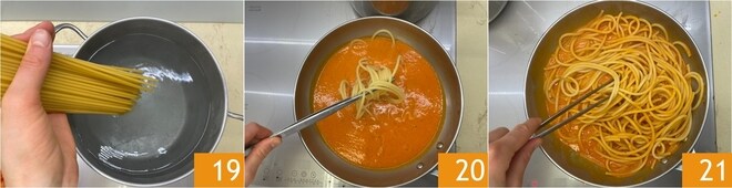 Kochen Sie die Bucatini in kochendem Salzwasser 19. Wenn sie al dente sind, lassen Sie sie zusammen mit der Soße in die Pfanne abtropfen 20. Mischen Sie alles und schwenken Sie die Pasta für eine Minute 21.