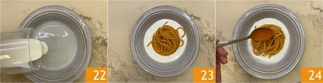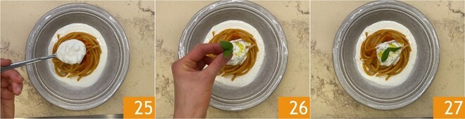 Servieren Sie Ihren Hauptgang, indem Sie zuerst die Stracciatellacreme auf den Tellerboden geben 22, dann ein großzügiges Nest aus Bucatini darauflegen 23 und mit einem Löffel Soße garnieren 24.
