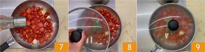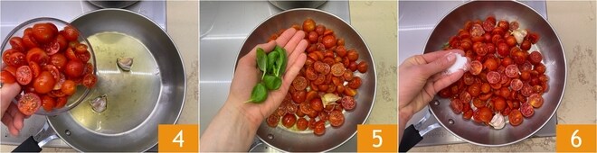 Nach 3 Minuten die Kirschtomaten hinzufügen 4, mit den Basilikumblättern parfümieren 5 und mit Salz abschmecken 6.