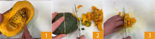 Um die Pasta mit Kürbis und Amaretti zuzubereiten, beginnen Sie mit dem Säubern des Kürbisses: Entfernen Sie die Kerne und die inneren Fasern mit einem Löffel 1, schälen Sie ihn dann mit einem scharfen Messer 2 und schneiden Sie das Fruchtfleisch in regelmäßige Würfel von etwa 2 cm 3; Sie erhalten etwa 500 g gesäuberten Kürbis.