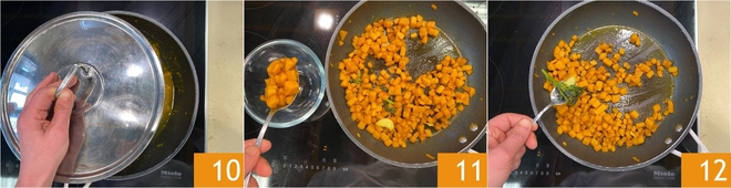 Fügen Sie etwas Wasser hinzu, um das Garen zu erleichtern. Kochen Sie es 10–15 Minuten mit Deckel 10, gelegentlich umrühren, bis der Kürbis weich ist. In der Zwischenzeit bringen Sie einen Topf mit Salzwasser zum Kochen für die Nudelzubereitung. Entnehmen Sie nun einen Teil der Kürbiswürfel für die abschließende Garnitur 11 und entfernen Sie Knoblauch und Salbei 12.
