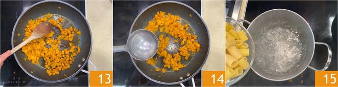 Drücken Sie den restlichen Kürbis direkt in der Pfanne, um eine grobe Creme zu erhalten 13. Falls nötig, fügen Sie einen Spritzer Kochwasser hinzu, um die Konsistenz anzupassen 14. Kochen Sie die Pasta in kochendem Salzwasser 15.