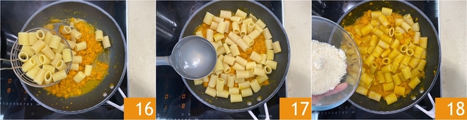Gießen Sie die Pasta al dente ab und geben Sie sie in die Pfanne mit der Kürbiscreme 16. Fügen Sie etwas Kochwasser hinzu, um die Sauce besser zu binden 17, dann vermengen Sie mit geriebenem Käse und einem Schuss Öl 18.