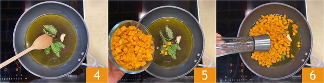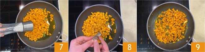 Erhitzen Sie reichlich Öl in einer großen Pfanne, fügen Sie den Knoblauch und die Salbeiblätter hinzu 4 und lassen Sie sie bei mittlerer Hitze anbraten, bis der Knoblauch goldbraun ist 4. Fügen Sie den Kürbis hinzu 5 und würzen Sie mit frisch gemahlenem schwarzen Pfeffer 6.
