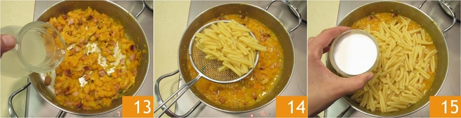 Verlängert die Sauce mit etwas Kochwasser der Pasta, bis sie flüssig genug ist 13. In der Zwischenzeit die Pasta in die Pfanne abgießen 14, die flüssige Sahne 15, Pfeffer nach Geschmack hinzufügen und kurz durchschwenken, bis alles gut vermischt ist.