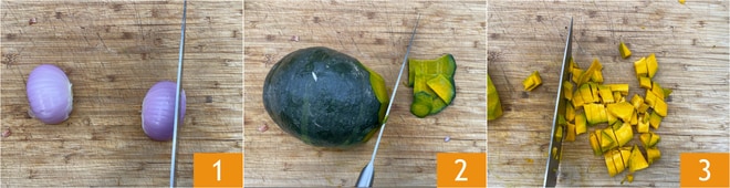 Um die Pasta mit Kürbiscreme und Guanciale zuzubereiten, zuerst die Zwiebel putzen und in Scheiben schneiden 1. Etwa 500 g Kürbis säubern 2, 430 g Fruchtfleisch herausnehmen und in Würfel schneiden 3.