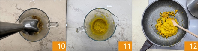 Mit dem Stabmixer pürieren 10, um eine Creme zu erhalten 11. Die erhaltene Creme in die Pfanne geben 12 und beiseite stellen.