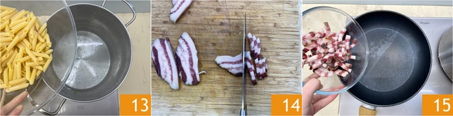 Die Pasta in gesalzenem kochendem Wasser kochen 13. Den Guanciale in Streifen schneiden 14, dann in einer leicht erhitzten Pfanne ohne Zugabe von Fett anbraten 15: er sollte knusprig werden.