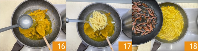 Die Creme mit dem Kochwasser der Pasta verdünnen 16, die gekochten Penne hier abgießen 17 und den knusprigen Guanciale hinzufügen 18.