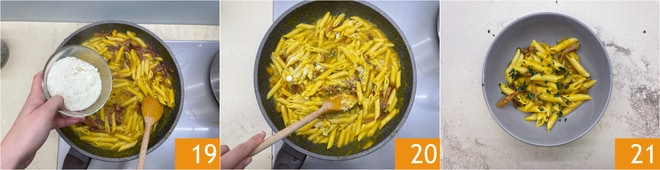 Die Pasta auf mittlerer Hitze vermengen. Dann auch den Parmigiano Reggiano DOP hinzufügen 19 und mischen 20. Anrichten und die Pasta mit Kürbiscreme und Guanciale mit frischer Petersilie servieren 21.