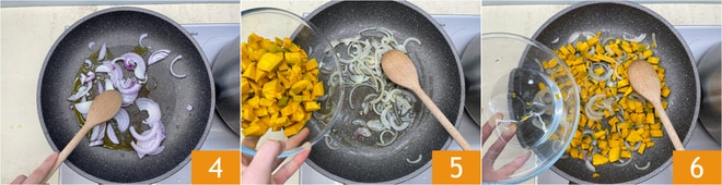 In einer Pfanne das natives Olivenöl extra zusammen mit der Zwiebel erhitzen 4, andünsten lassen und wenn die Zwiebel weich ist, den Kürbis hinzugeben 5, auf mittlerer Hitze ziehen lassen, dann salzen und Wasser hinzugeben 6.