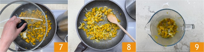 Mit dem Deckel abdecken 7 und etwa 10 Minuten auf mittlerer Hitze kochen lassen, gelegentlich umrühren. Wenn der Kürbis weich ist 8, einen Teil davon in ein Gefäß geben 9.