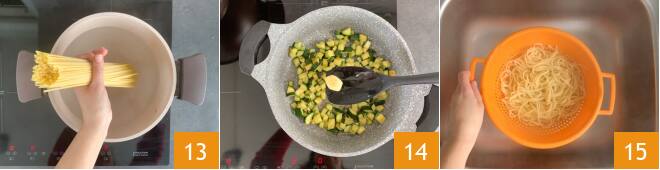 Kochen Sie die Linguine gemäß der auf der Packung angegebenen Zeit 13. Inzwischen haben die Zucchini das Kochen beendet, entfernen Sie die Knoblauchzehe und legen Sie sie beiseite 14. Wenn die Linguine gekocht sind, abgießen 15.