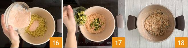 Mit der zuvor zubereiteten Lachscreme 16 und den gebratenen Zucchini 17 würzen. Umrühren, um Geschmack zu verleihen, und die Pasta mit Lachscreme und Zucchini heiß servieren 18.