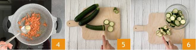 Am Ende des Kochens entfernen Sie die Knoblauchzehe und schalten das Feuer aus 4. Kürzen Sie die Zucchini, schneiden Sie sie dann zuerst in Scheiben 5 und dann in kleine Würfel 6.