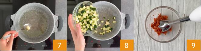 Geben Sie erneut einen Schuss Olivenöl in den Topf und braten Sie die zweite Knoblauchzehe an 7. Nach ein paar Sekunden die Zucchini hinzufügen 8, salzen und pfeffern. Etwa 15 Minuten bei mittlerer Hitze kochen, häufig umrühren. In der Zwischenzeit einen Topf mit gesalzenem Wasser zum Kochen bringen. Inzwischen den gekochten Lachs mit Hilfe eines Stabmixers für ein paar Sekunden pürieren 9.