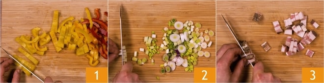 Um die Pasta mit Paprika und Speck zuzubereiten, bereiten Sie zuerst die Zutaten vor: Reinigen Sie die Paprika, indem Sie die obere Kappe, die Innenwände und die Samen entfernen, dann in nicht zu dünne Streifen schneiden 1. Säubern und schneiden Sie auch die Frühlingszwiebeln, einschließlich des grünen Teils 2. Schneiden Sie schließlich den Speck in Würfel 3.