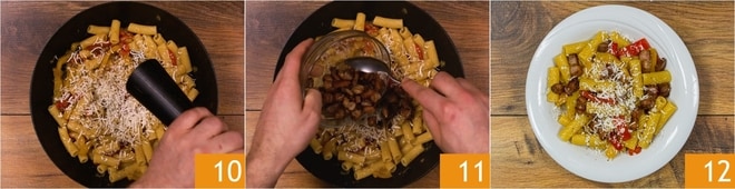 Nehmen Sie die Pfanne vom Herd, fügen Sie den geriebenen gesalzenen Ricotta und eine Prise Pfeffer hinzu 10, dann fügen Sie den beiseite gelegten Speck hinzu 11. Gut mischen und Ihre Pasta mit Paprika und Speck servieren, indem Sie nach Belieben noch mehr gesalzenen Ricotta und Pfeffer hinzufügen 12!