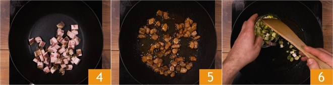 Erhitzen Sie eine große Pfanne und braten Sie den Speck bei mittlerer Hitze an 4. Wenn er knusprig und goldbraun ist 5, nehmen Sie den Speck heraus und lassen das Fett in der Pfanne. Fügen Sie die Frühlingszwiebeln hinzu 6 und braten Sie sie für ein paar Minuten bei mittlerer Hitze an.