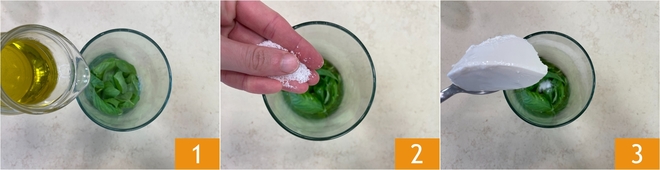 Um die Pasta mit Pesto, Muscheln und Kartoffeln zuzubereiten, beginnen Sie mit dem Pesto: Geben Sie die Basilikumblätter, das Olivenöl extra vergine 1, das Salz und den Ricotta 2 in den Mixer.