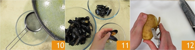 Gießen Sie die Muscheln ab und bewahren Sie das Kochwasser auf, indem Sie es durch ein Sieb filtern 10, dann schälen Sie sie 11. Gehen Sie zu den Kartoffeln über: Entfernen Sie die Schale 12.