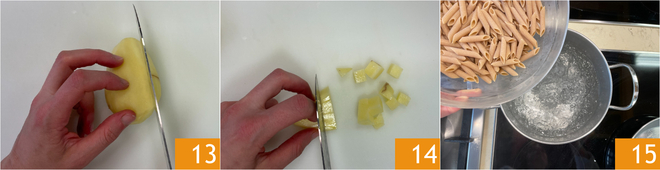 Schneiden Sie sie zuerst in Scheiben 13 und dann in Würfel von etwa 5 mm 14. In der Zwischenzeit bringen Sie reichlich gesalzenes Wasser zum Kochen und kochen Sie die Pasta 15.