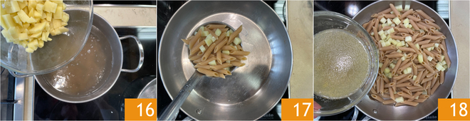 Wenn noch 5 Minuten bis zum Ende der Kochzeit fehlen, fügen Sie auch die Kartoffeln hinzu 16. Gießen Sie alles zusammen direkt in eine Pfanne ab 17, dann fügen Sie das gefilterte Muschelwasser hinzu und beenden Sie das Kochen der Pasta 18.