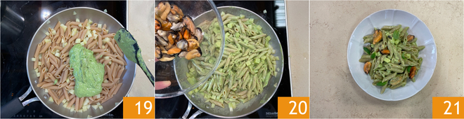 Schalten Sie die Hitze aus, fügen Sie das Pesto 19 und die Muscheln 20 hinzu, dann gut mischen. Servieren Sie Ihre Pasta mit Pesto, Muscheln und Kartoffeln, indem Sie die Teller mit ein paar Blättchen frischem Basilikum garnieren 21!