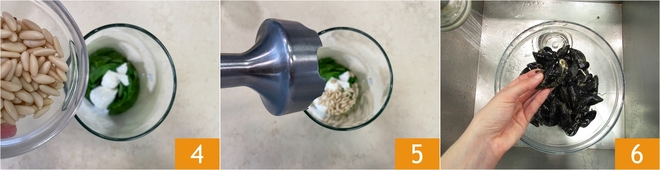 Fügen Sie die Pinienkerne 4 hinzu und pürieren Sie mit dem Stabmixer 5, bis Sie eine homogene Masse erhalten, dann beiseite stellen. Kümmern Sie sich um die Muscheln: Spülen Sie sie unter kaltem fließendem Wasser ab, entfernen Sie die Ablagerungen auf der Schale mit einer harten Bürste oder einem Stahlschwamm, und ziehen Sie dann den Byssus (den Faden, der aus der Schale kommt) heraus. Spülen Sie sie gut ab und sortieren Sie die gebrochenen oder bereits geöffneten aus 6.