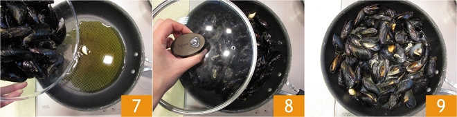 Erhitzen Sie einen Schuss Öl in einer Pfanne und fügen Sie die Muscheln hinzu 7, dann decken Sie mit einem Deckel ab 8 und kochen Sie etwa 5 Minuten, bis sie sich geöffnet haben 9.