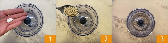 Um die Pasta mit Pesto und Kirschtomaten zuzubereiten, bereiten Sie zuerst das Pesto zu: Geben Sie eine halbe Knoblauchzehe 1 und die Pinienkerne 2 in den Mixer und mixen Sie alles für ein paar Sekunden 3.