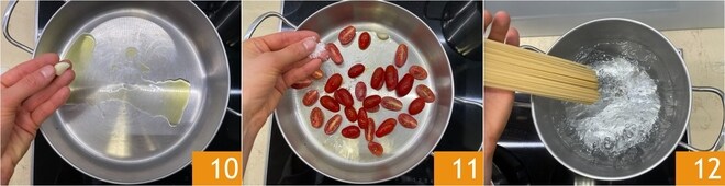 Stellen Sie einen Topf mit gesalzenem Wasser auf den Herd, in dem Sie die Pasta kochen werden. Geben Sie inzwischen in eine Pfanne 2 Teelöffel Öl und eine Knoblauchzehe 10. Lassen Sie alles aromatisieren, dann fügen Sie auch die Kirschtomaten hinzu und salzen Sie 11. Kochen Sie sie etwa 5 Minuten, indem Sie sie leicht zerdrücken. Sobald das Wasser kocht, geben Sie die Linguine hinein 12.