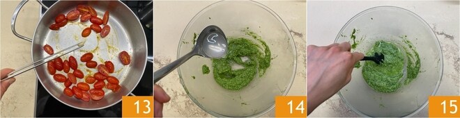 Während die Pasta kocht, entfernen Sie die Knoblauchzehe von den Kirschtomaten 13. Geben Sie das Pesto in eine Schüssel, fügen Sie eine kleine Kelle Nudelkochwasser hinzu 14 und rühren Sie gut um 15.
