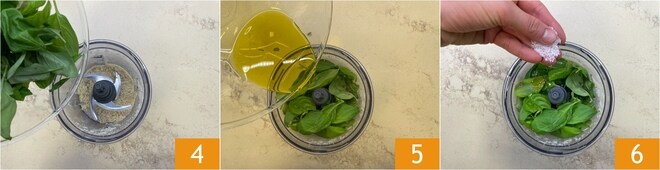 Fügen Sie das Basilikum 4, das Öl 5 und eine Prise Salz 6 hinzu.