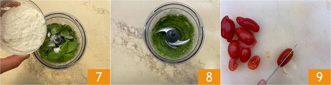 Geben Sie auch den geriebenen Pecorino 7 hinzu und mixen Sie erneut, bis Sie eine Creme erhalten 8. Das Pesto ist fertig, stellen Sie es beiseite. Nun zu den Kirschtomaten: Waschen Sie sie und halbieren Sie sie 9.