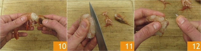 Gehen Sie zur Reinigung der Garnelen über: Entfernen Sie den Kopf 10 und den Panzer, dann ritzen Sie den Rücken mit einem kleinen Messer ein 11 und entfernen Sie vorsichtig den inneren Faden 12.
