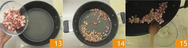 Schneiden Sie den Speck und geben Sie ihn in eine bereits heiße Pfanne 13, braten Sie ihn einige Minuten an, bis er goldbraun und knusprig ist 14. Legen Sie den Speck beiseite 15 und bewahren Sie die Pfanne mit dem Bratensatz auf.