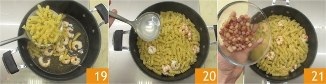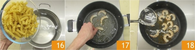 In der Zwischenzeit ist das Wasser zum Kochen gekommen, geben Sie daher die Nudeln hinein 16 und kochen Sie sie 3 Minuten weniger als die auf der Packung angegebene Zeit. In der Pfanne, in der Sie den Speck angebraten haben, braten Sie die Garnelen auf einer Seite für ein paar Minuten 17, dann deglacieren Sie den Bratensatz mit einer Kelle des Nudelkochwassers 18 und stellen Sie das Feuer aus.