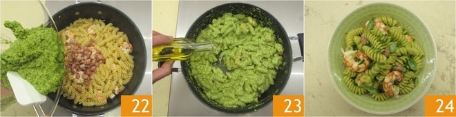 Fügen Sie auch das Pistazienpesto hinzu 22, mischen Sie gut und schwenken Sie alles, bis die Flüssigkeit aufgenommen ist. Zum Schluss würzen Sie mit einem Schuss Rohöl 23. Ihre Nudeln mit Pistazienpesto und Garnelen sind bereit zum Servieren 24!