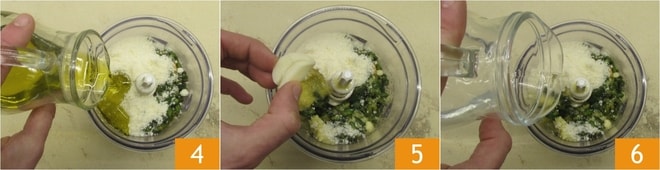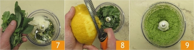 Fügen Sie auch die Basilikumblätter 7 und die abgeriebene Zitronenschale 8 hinzu, salzen, pfeffern und mixen, bis Sie eine cremige und homogene Konsistenz erhalten 9.