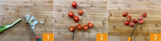 Um die Pasta mit Ricotta und Kirschtomaten zuzubereiten, schneiden Sie zuerst die Frühlingszwiebel in Ringe 1. Halbieren Sie sowohl die Kirschtomaten 2 als auch die Datterini 3.